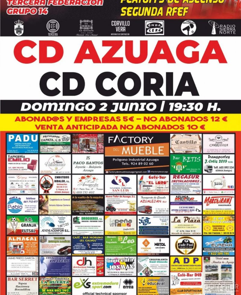 Este domingo 2 de junio, se llevará a cabo un emocionante partido que no podéis perderos: la Final Autonómica por el Ascenso a 2RFEF entre el CD Azuaga y el CD Coria. El encuentro se disputará a las 19:30h en el Estadio Municipal de Deportes de Azuaga.